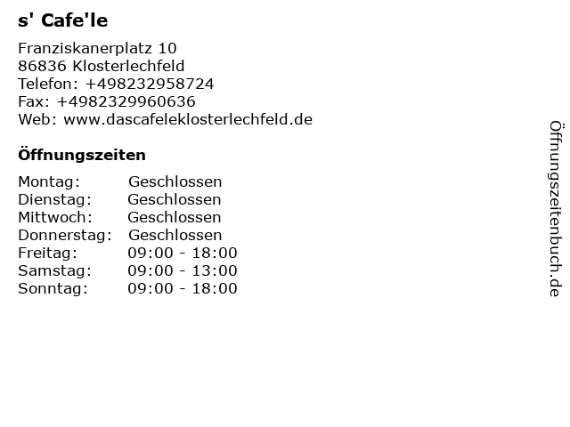 | Öffnungszeiten Belindas s'Cafele in Klosterlechfeld anzeigen | |