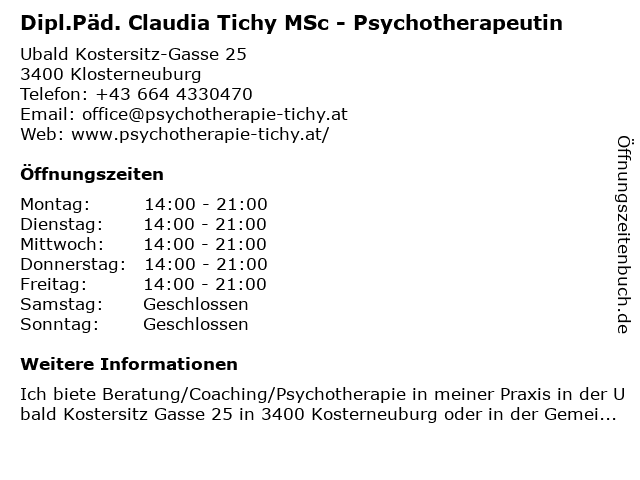 Branchen & Suchbegriffe zu Dipl.Päd. Claudia Tichy MSc - Psychotherapeutin:aquatische körpertherapeutin, beratungslehrerin, claudia, coaching, dipl.päd., diplompädagogin, lebensberaterin, msc, psychosoziale beratung, psychotherapeutin, psychotherapie, psychotherapie klosterneuburg, sozialberaterin, tichy |