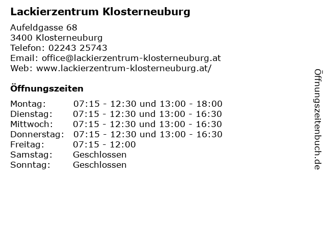 1 Lackierzentrum Klosterneuburg Kaltenbrunner GmbH & Co KG (Entfernung: 0,01 km) Aufeldgasse 68, 3400 Klosterneuburg 6 |