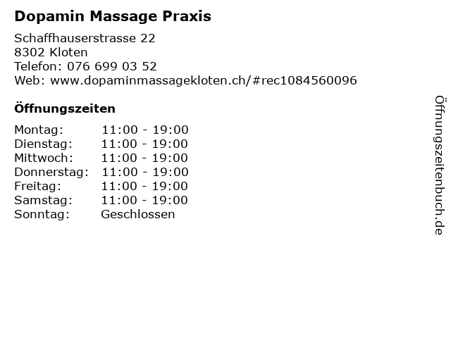 | Öffnungszeiten Dopamin Massage Praxis in Kloten anzeigen | |