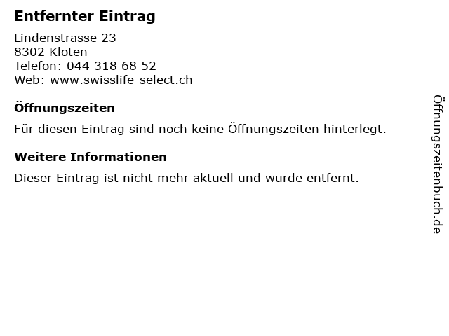 | Öffnungszeiten Entfernter Eintrag in Kloten anzeigen | |