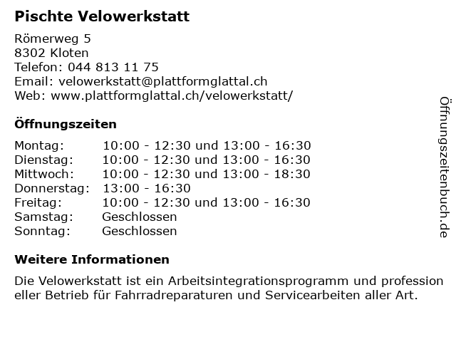 | Öffnungszeiten Pischte Velowerkstatt in Kloten anzeigen | |