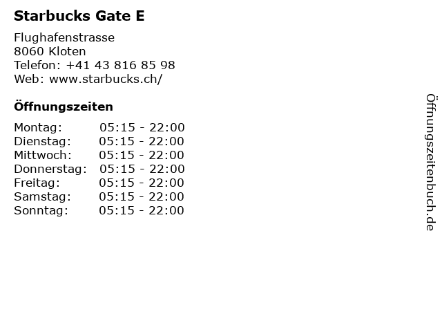 | Öffnungszeiten Starbucks Gate E in Kloten anzeigen | |