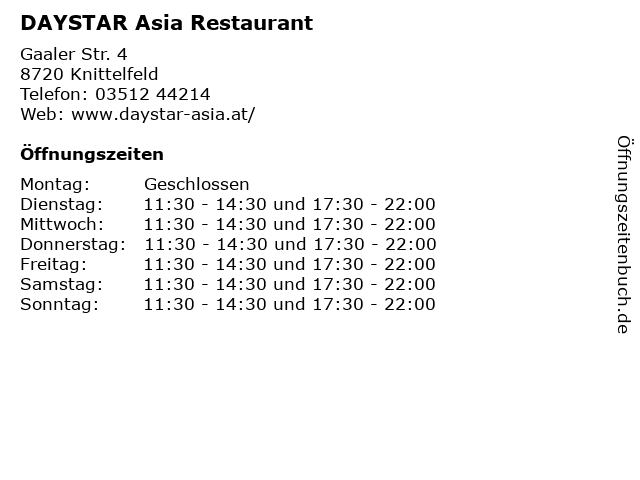 | Öffnungszeiten DAYSTAR Asia Restaurant in Knittelfeld anzeigen | |