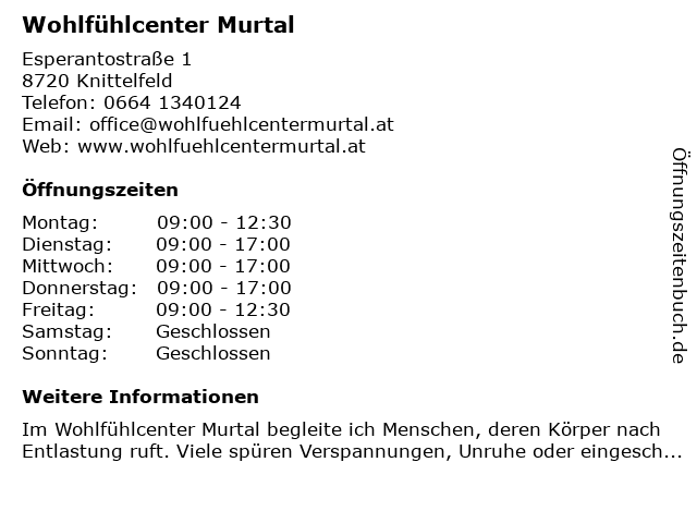 | Öffnungszeiten Wohlfühlcenter Murtal in Knittelfeld anzeigen | |