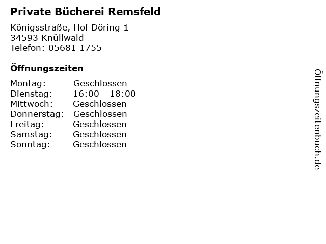 | Öffnungszeiten Private Bücherei Remsfeld in Knüllwald anzeigen | |