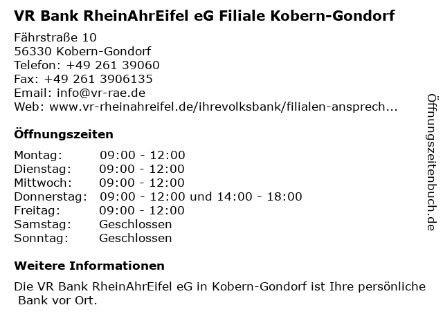 2 VR Bank Rhein-Mosel eG - Geschäftsstelle Kobern-Gondorf (Entfernung: 0,00 km) Fährstr. 10, 56330 Kobern-Gondorf 6 |