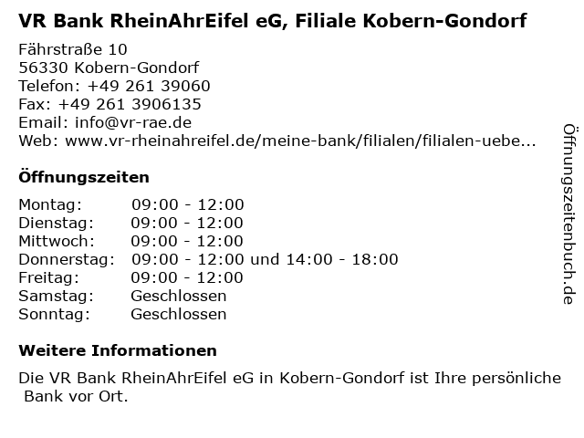 Branchen & Suchbegriffe zu VR Bank RheinAhrEifel eG, Filiale Kobern-Gondorf:bank, beratung, eg, geldautomat, genossenschaft, gondorf, immobilienagentur, kobern, kredit, rheinahreifel, versicherung, vr |