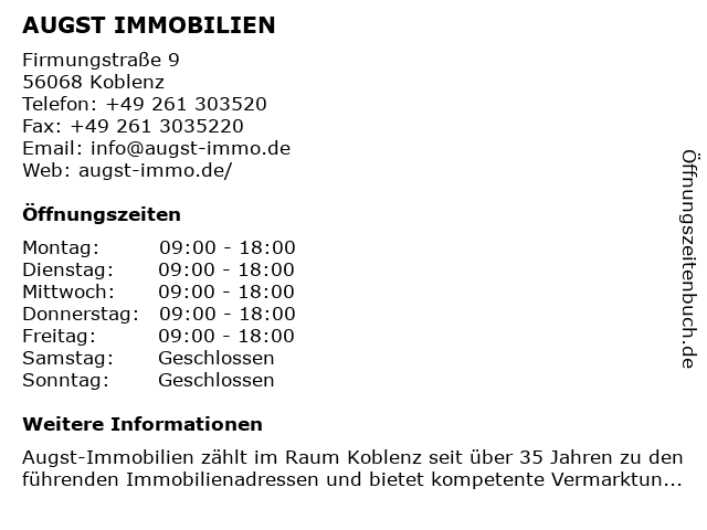 | Öffnungszeiten AUGST IMMOBILIEN in Koblenz anzeigen | |