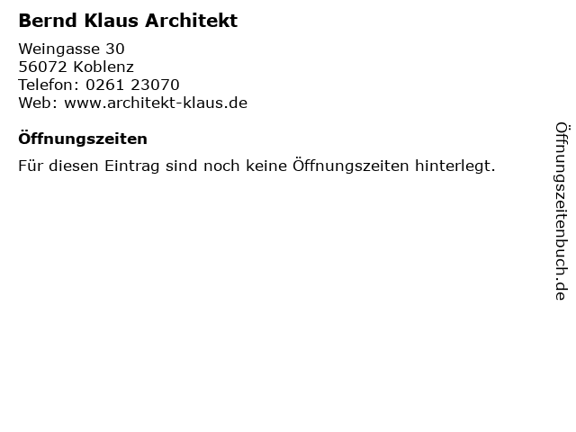 | Öffnungszeiten Bernd Klaus Architekt in Koblenz anzeigen | |