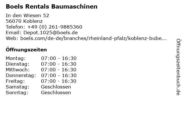 | Öffnungszeiten Boels Rentals Baumaschinen in Koblenz anzeigen | |