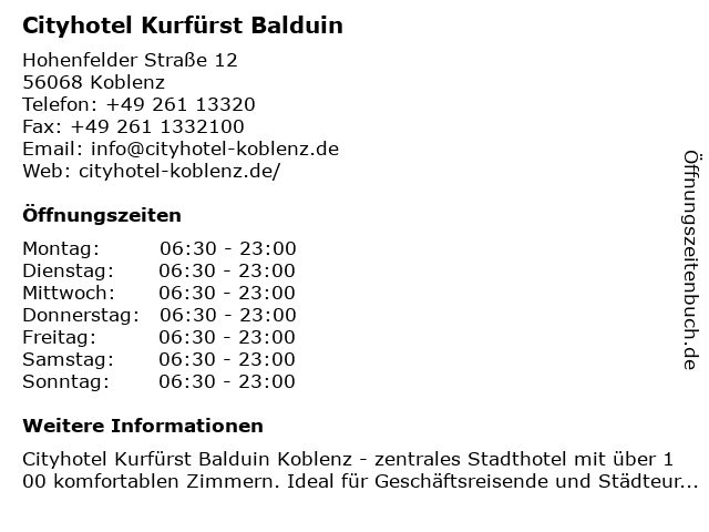 | Öffnungszeiten Cityhotel Kurfürst Balduin in Koblenz anzeigen | |