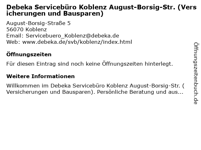 Branchen & Suchbegriffe zu Debeka Servicebüro Koblenz August-Borsig-Str. (Versicherungen und Bausparen):altersvorsorge, august, bausparen, beihilfe, betriebliche vorsorge, borsig, debeka, finanzieren, geldanlage, gewerbeversicherung, haftpflicht, hausrat, immobilienservice, kfz-versicherung, krankenversicherung, lebensversicherung, rechtsschutz, rentenversicherung, service, servicebüro, str., versicherung, versicherungen, versicherungsberatung, zahnzusatzversicherung |