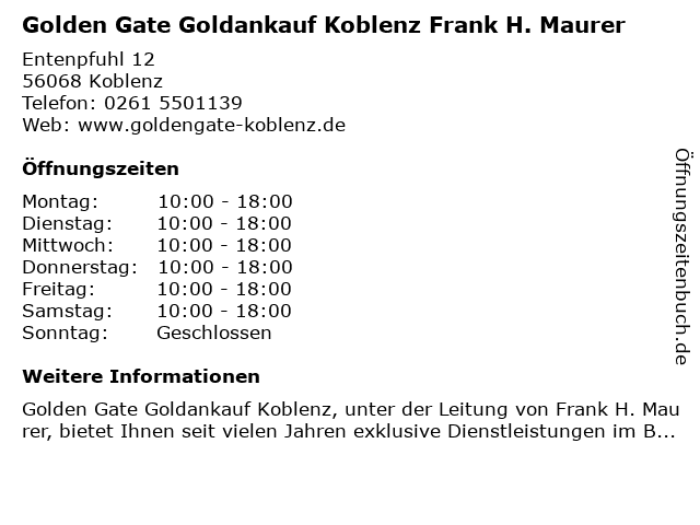 Branchen & Suchbegriffe zu Golden Gate Goldankauf Koblenz Frank H. Maurer:frank, gate, goldankauf, golden, h., maurer |
