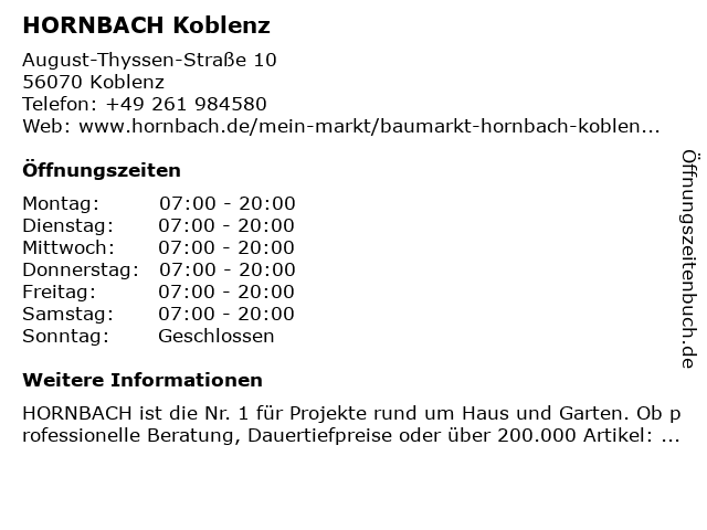 | Öffnungszeiten HORNBACH Koblenz in Koblenz anzeigen | |