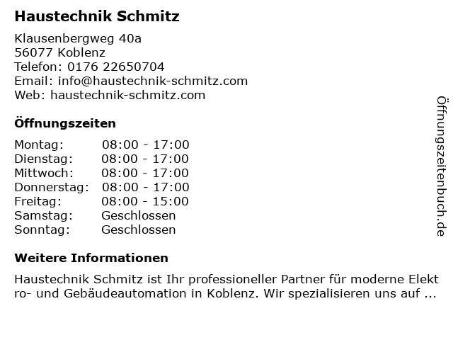 | Öffnungszeiten Haustechnik Schmitz in Koblenz anzeigen | |