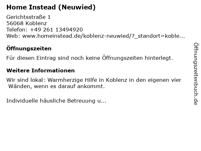 | Öffnungszeiten Home Instead (Neuwied) in Koblenz anzeigen | |