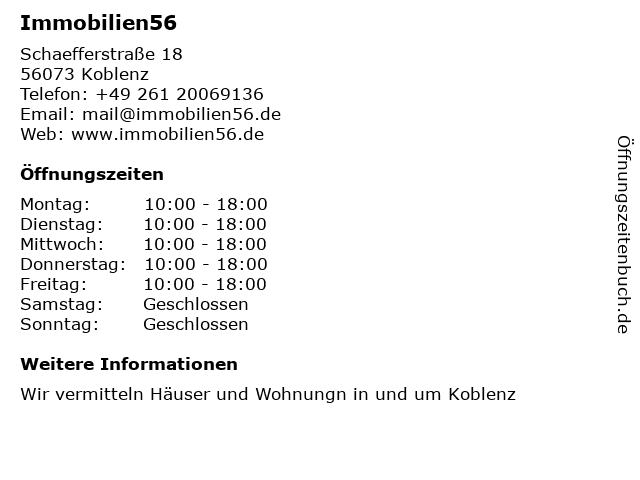 | Öffnungszeiten Immobilien56 in Koblenz anzeigen | |