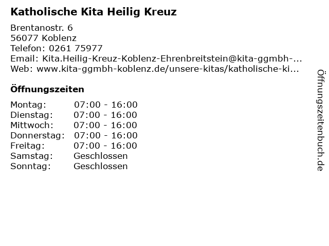 | Öffnungszeiten Katholische Kita Heilig Kreuz in Koblenz anzeigen | |