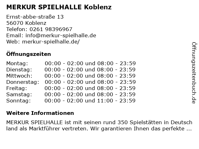 | Öffnungszeiten MERKUR SPIELHALLE Koblenz in Koblenz anzeigen | |