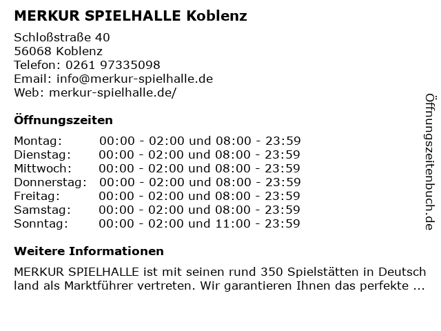 | Öffnungszeiten MERKUR SPIELHALLE Koblenz in Koblenz anzeigen | |