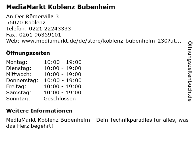 | Öffnungszeiten MediaMarkt Koblenz Bubenheim in Koblenz anzeigen | |