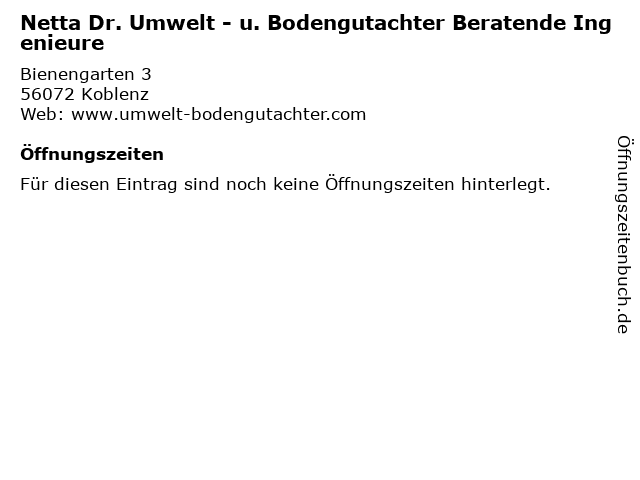 | Öffnungszeiten Netta Dr. Umwelt - u. Bodengutachter Beratende Ingenieure in Koblenz anzeigen | |