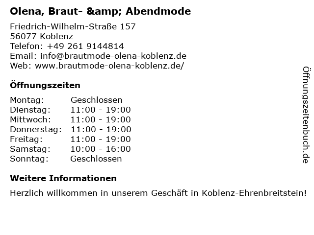| Öffnungszeiten Olena, Braut- & Abendmode in Koblenz anzeigen | |