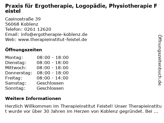 1 Alexandra Victoria Hanki Praxis für Logopädie und Systemische Lösungen (Entfernung: 0,24 km) Viktoriastr. 32, 56068 Koblenz 4 Praxis für Ergotherapie & Coaching Mary-Ann Mastronardi (Entfernung: 0,42 km) Firmungstr. 40, 56068 Koblenz 5 Praxis für Ergotherapie und Gestalttherapie Iris Leiß (Entfernung: 0,86 km) Kurfürstenstr. 55, 56068 Koblenz 6 Praxis für Logopädie und Entspannungstherapie Marion Dennhardt (Entfernung: 1,44 km) Vor dem Sauerwassertor 8, 56077 Koblenz |