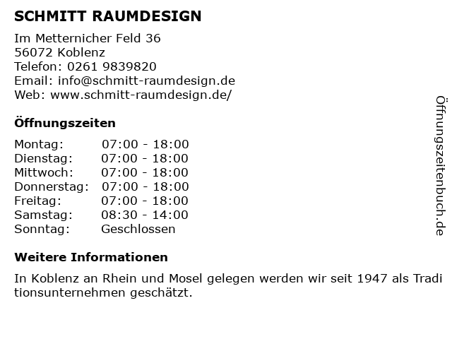 | Öffnungszeiten SCHMITT RAUMDESIGN in Koblenz anzeigen | |