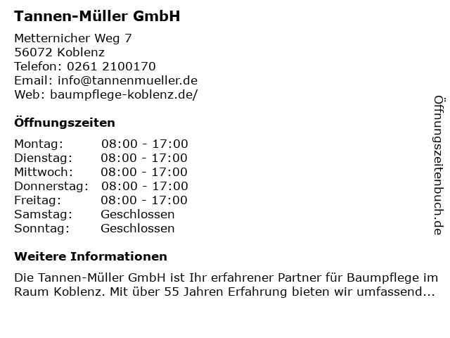 | Öffnungszeiten Tannen-Müller GmbH in Koblenz anzeigen | |