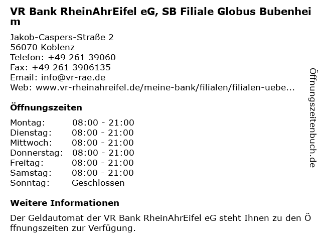 Branchen & Suchbegriffe zu VR Bank RheinAhrEifel eG, SB Filiale Globus Bubenheim:bank, bubenheim, eg, geldautomat, globus, rheinahreifel, sb, vr |