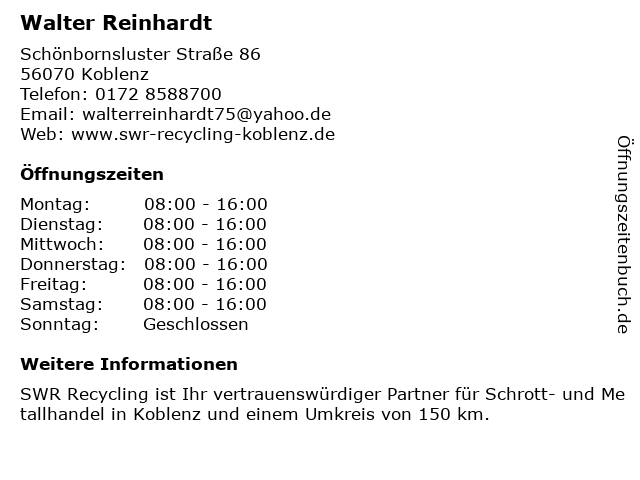 | Öffnungszeiten Walter Reinhardt in Koblenz anzeigen | |