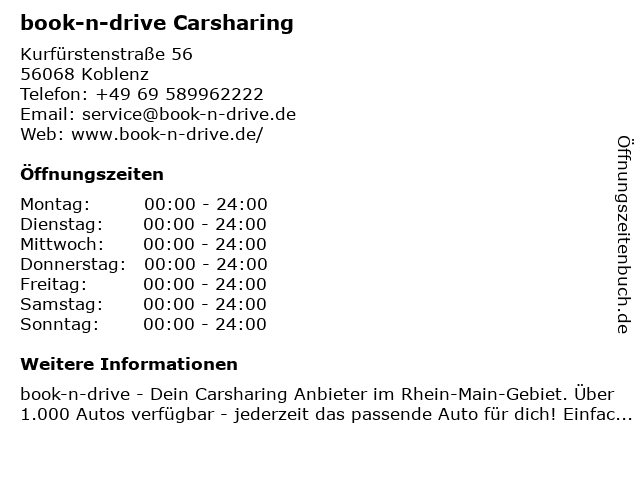 | Öffnungszeiten book-n-drive Carsharing in Koblenz anzeigen | |