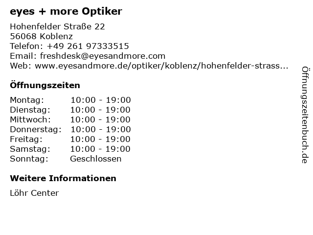 | Öffnungszeiten eyes + more Optiker in Koblenz anzeigen | |