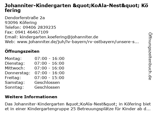 Branchen & Suchbegriffe zu Johanniter-Kindergarten "KoAla-Nest" Köfering:"koala, agentur für kinderbetreuung, gemeinnützige organisation, hilfsorganisation, johanniter, kindergarten, köfering, nest", sozialarbeit, verband, wohlfahrtseinrichtung |