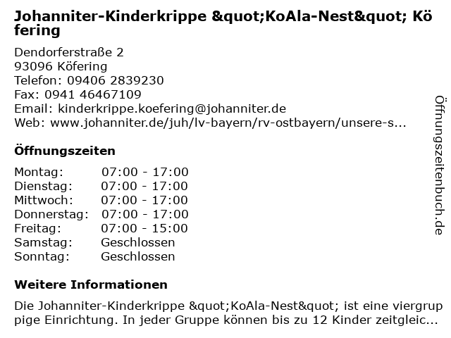 Branchen & Suchbegriffe zu Johanniter-Kinderkrippe "KoAla-Nest" Köfering:"koala, agentur für kinderbetreuung, gemeinnützige organisation, hilfsorganisation, johanniter, kinderkrippe, köfering, nest", sozialarbeit, verband, wohlfahrtseinrichtung |