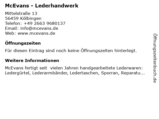 | Telefonnummer McEvans - Lederhandwerk in Kölbingen (+49 2663 9680137) anrufen | |