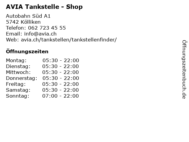 | Öffnungszeiten AVIA Tankstelle - Shop in Kölliken anzeigen | |
