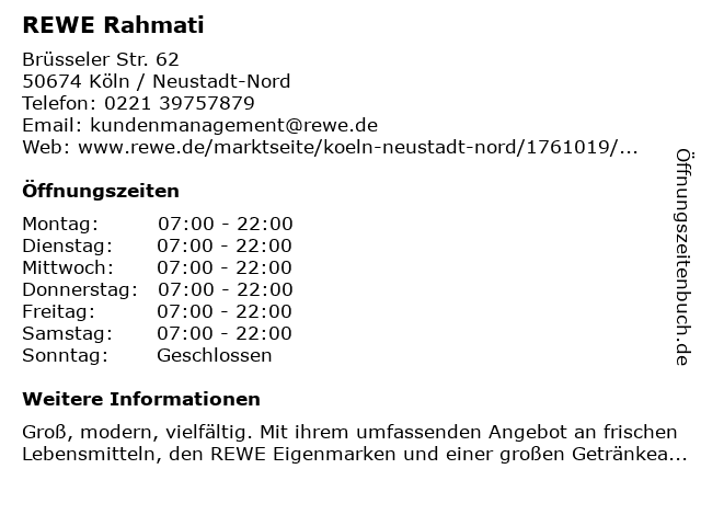 | Öffnungszeiten REWE Rahmati in Köln / Neustadt-Nord anzeigen | |