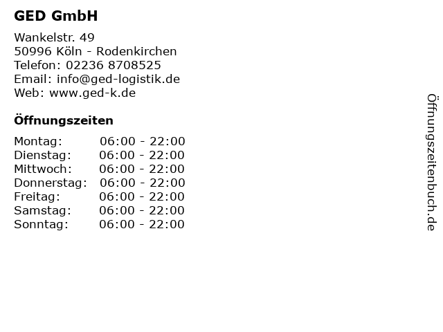 | Öffnungszeiten GED GmbH in Köln - Rodenkirchen anzeigen | |