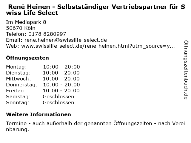 1 Günter Bialojahn - Selbstständiger Vertriebspartner für Swiss Life Select (Entfernung: 0,00 km) Im Mediapark 8, 50670 Köln 2 Henrik Erkens - Selbstständiger Vertriebspartner für Swiss Life Select (Entfernung: 0,00 km) Im Mediapark 8, 50670 Köln 6 |