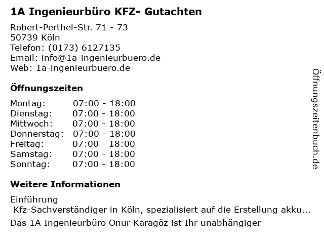 | Öffnungszeiten 1A Ingenieurbüro KFZ- Gutachten in Köln anzeigen | |