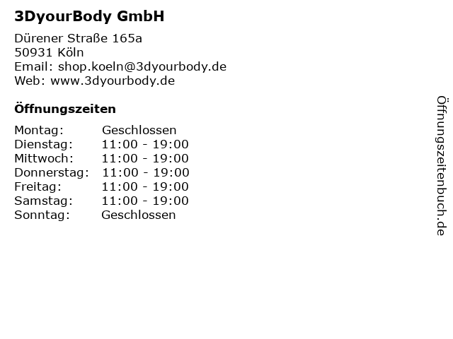 | Öffnungszeiten 3DyourBody GmbH in Köln anzeigen | |