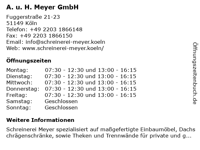 | Öffnungszeiten A. u. H. Meyer GmbH in Köln anzeigen | |