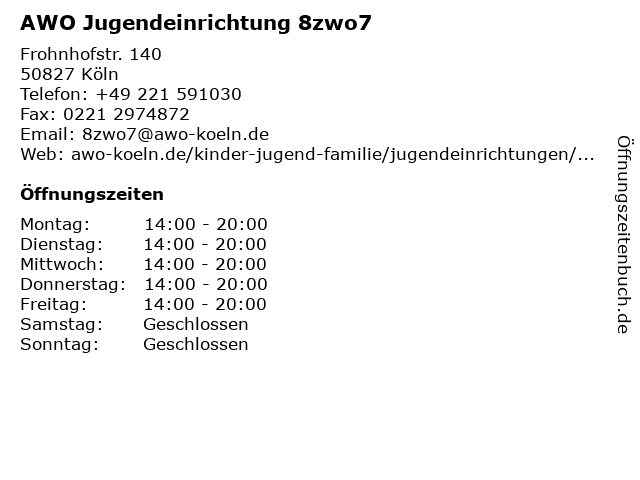 | Öffnungszeiten AWO Jugendeinrichtung 8zwo7 in Köln anzeigen | |