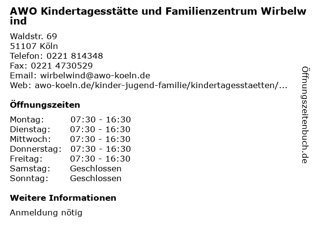 1 AWO Kindertagesstätte und Familienzentrum Kleine Insel (Entfernung: 0,11 km) Homarstr. 86, 51107 Köln 6 |