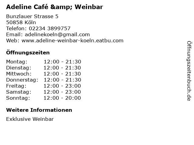 | Öffnungszeiten Adeline Café & Weinbar in Köln anzeigen | |