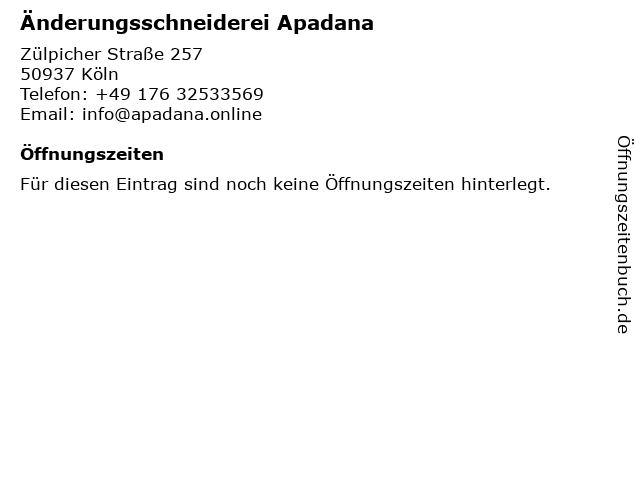 | Öffnungszeiten Änderungsschneiderei Apadana in Köln anzeigen | |