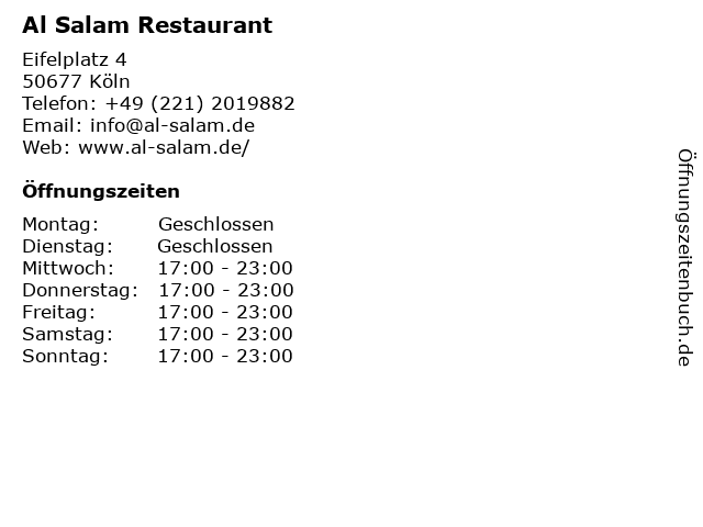 | Öffnungszeiten Al Salam Restaurant in Köln anzeigen | |